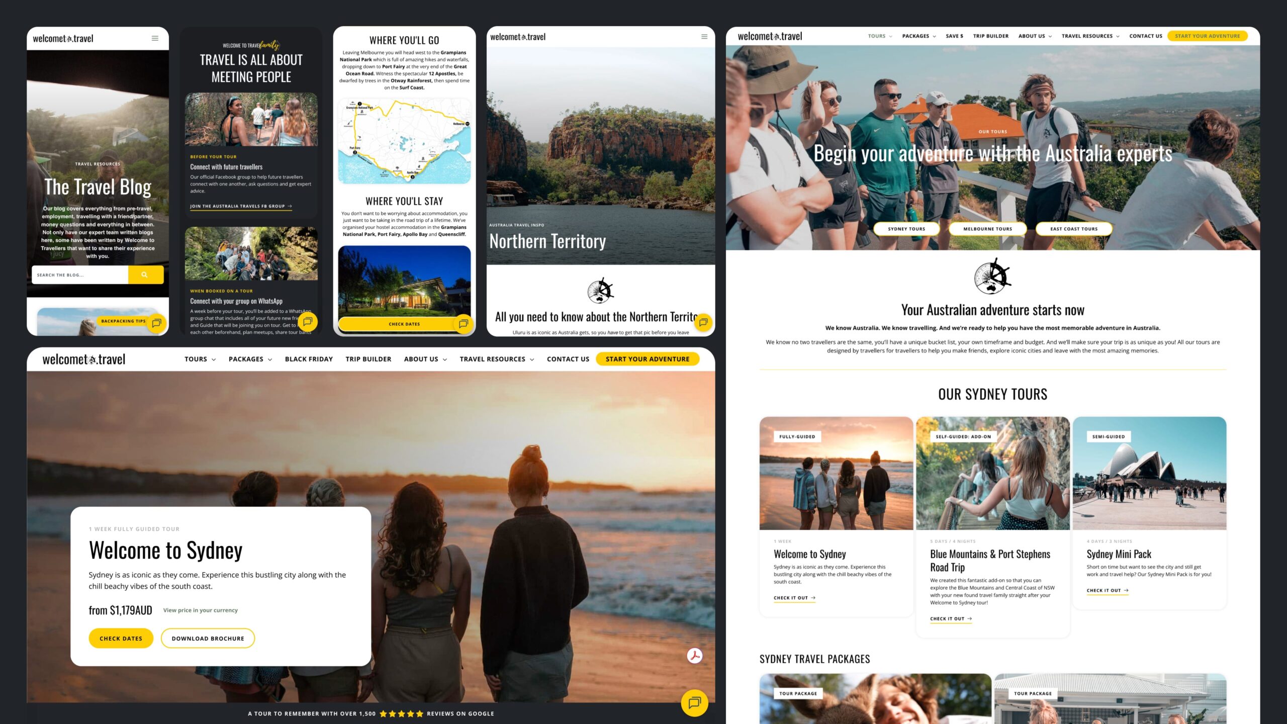 Welcome to Travel has experienced rapid growth, and it warranted a website and marketing materials that mirror the remarkable thoughtfulness, care, and value they invest in their tours and services. Through my design process, I ensure to focus on showcasing their extensive offerings in engaging ways, igniting excitement among travellers about exploring Australia with them.